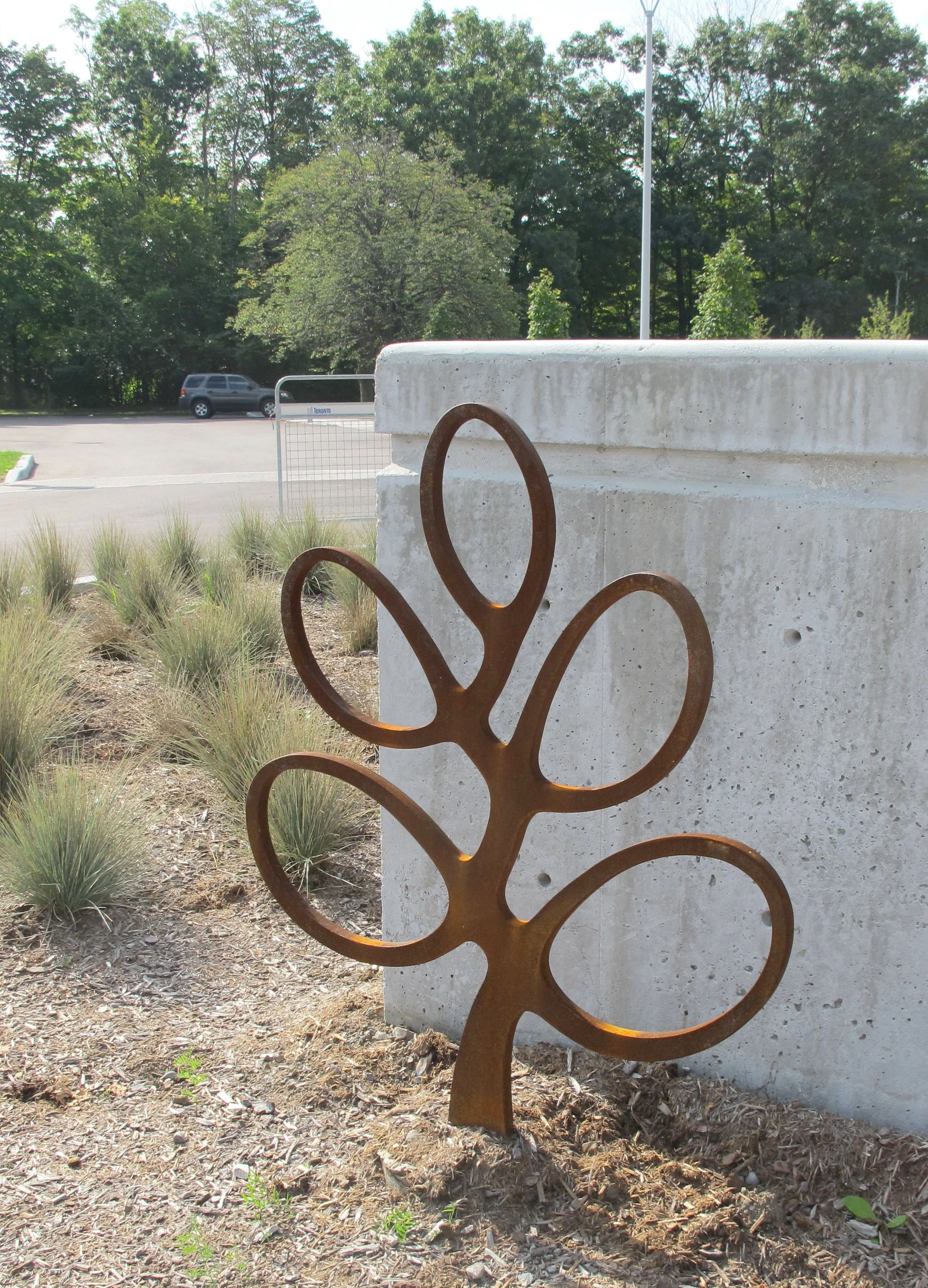 BikePlants are used as decorative elements around the parking lot and entry of the Toronto Botanical Garden.